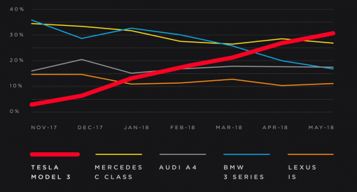 特斯拉還宣布,Model 3目前是美國最暢銷的高級轎車,以及在諸如寶馬3系,奔馳C級,奧迪A3和雷克薩斯IS等車型之前的客戶普及率。