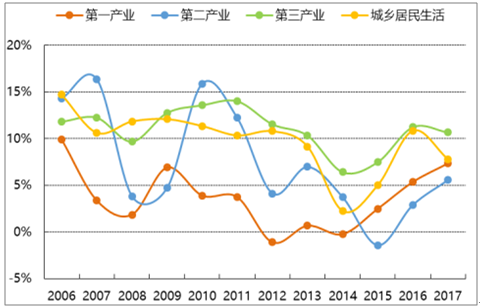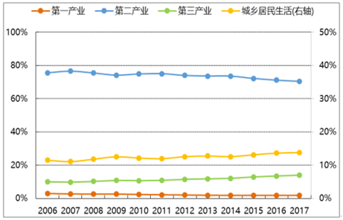 2006-2017年,全社會用電量同比增速呈階梯狀下降趨勢,和第二產業用電量增速近乎嚴格正相關。雖然,第二產業用電量占比逐年下降,仍處在 70%左右,是影響全社會用電量的絕對主力。第二產業的主體是制造業,其中用電量占比較高的為:紡織業、化學原料及化學制品制造業、橡膠和塑料制品業、非金屬礦物制品業、黑色金屬冶煉及壓延加工業、有色屬冶煉及壓延加工業、金屬制品業、通用及專用設備制造業、交通運輸、電氣、電子設備制造業。