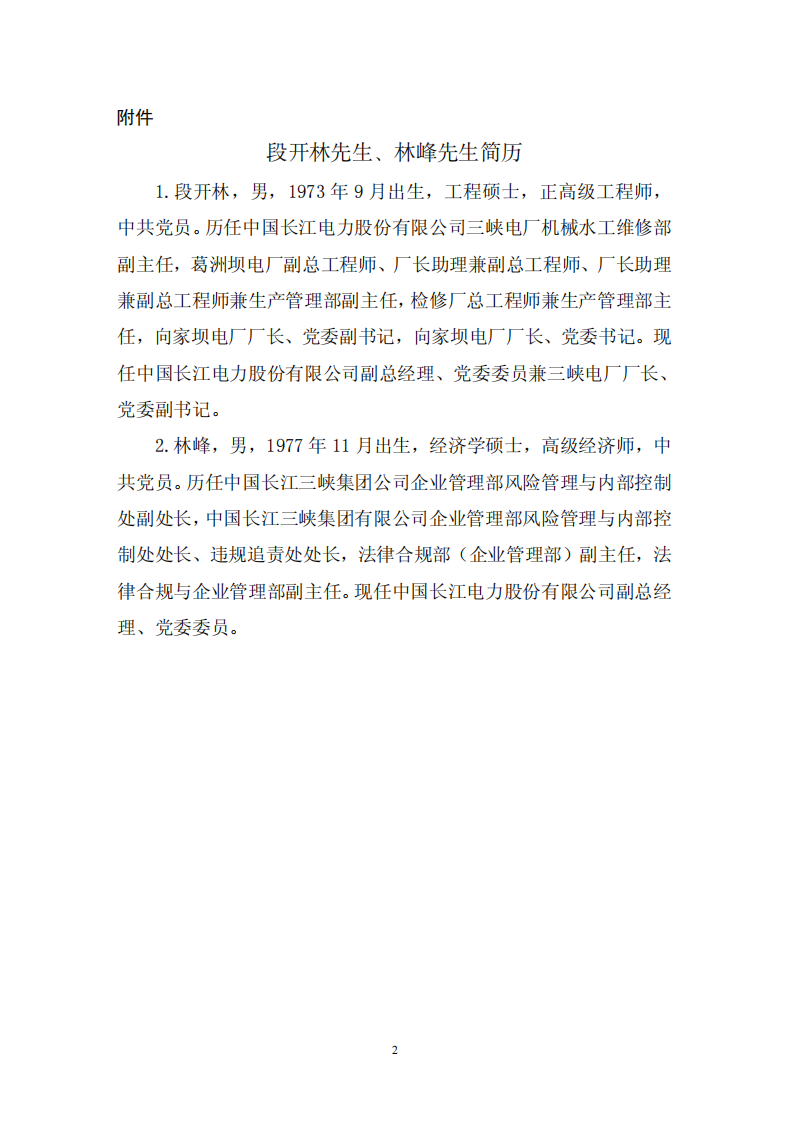 段開林、林峰任中國長江電力股份有限公司副總經(jīng)理