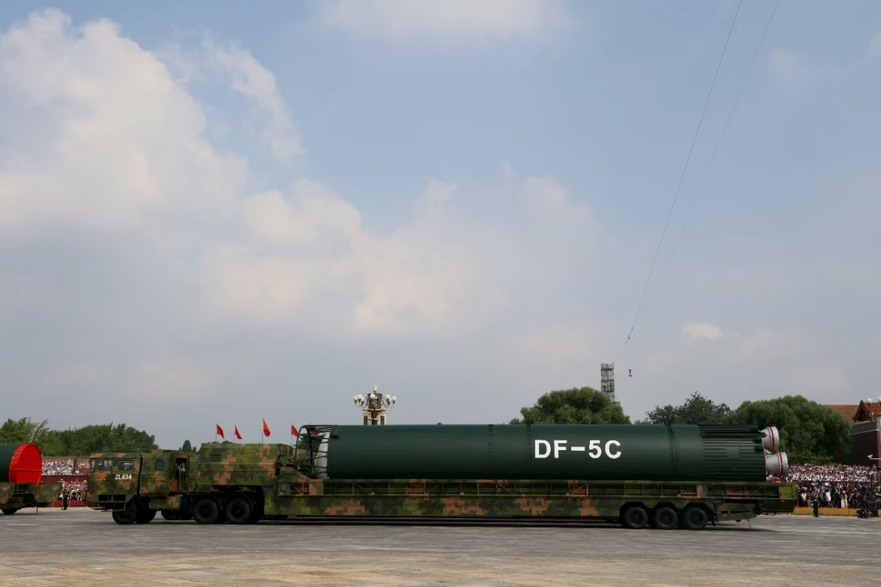 12臺大型導彈運輸車載著“東風-5C”液體洲際戰略核導彈浩蕩而來。核導彈第二方隊是裝備方隊壓軸出場的方隊。“東風-5C”液體洲際戰略核導彈是我國戰略反擊體系中的重要組成,打擊范圍覆蓋全球,全時戒備、有效威懾,以武止戈、砥定乾坤。方隊由火箭軍某基地牽頭抽組。