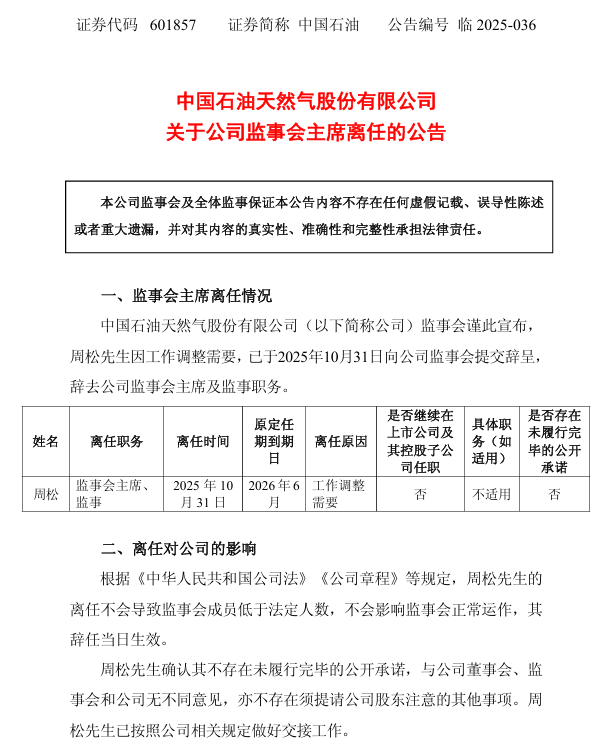 中國石油發布公告稱,公司監事會宣布,周松先生因工作調整需要,已于2025年10月31日向公司監事會提交辭呈,辭去公司監事會主席及監事職務。