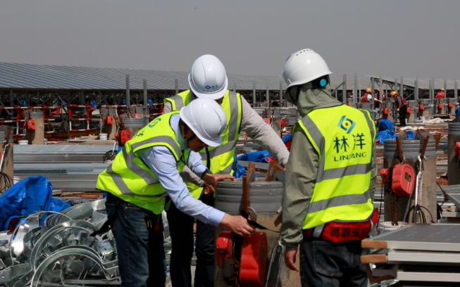 面對(duì)潮間帶施工困難的情況,林洋新能源建設(shè)團(tuán)隊(duì)將先筑臺(tái)、后建站定為首要任務(wù)。根據(jù)施工規(guī)劃,兩座6400平方米的貝雷結(jié)構(gòu)平臺(tái)需在1個(gè)月內(nèi)建成,項(xiàng)目組實(shí)行設(shè)計(jì)、施工、監(jiān)測(cè)三班倒機(jī)制:技術(shù)組白天駐守現(xiàn)場(chǎng)優(yōu)化鋼管樁打入角度,夜晚核算貝雷架承重?cái)?shù)據(jù);施工隊(duì)分成打樁、焊接、防腐三個(gè)班組交叉作業(yè),在每日兩次潮水退去的間隙搶工。在團(tuán)隊(duì)的齊心協(xié)作下,直徑0.63米的鋼管樁群穩(wěn)穩(wěn)扎入灘涂,連接平臺(tái)與海堤的鋼棧橋同步貫通,為后續(xù)近9萬根預(yù)制樁、百萬塊組件的運(yùn)輸安裝奠定基礎(chǔ)。