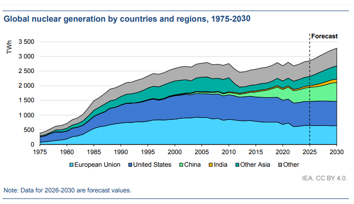 預計到2030年,中國的核電發電量將平均每年增長近6%,而美國和歐盟的核電發電量將保持基本穩定。因此,預計中國在全球核電中所占份額將從2025年的17%上升到2030年的20%,而美國的份額將從29%下降到25%,歐盟的份額將從23%下降到20%。盡管這些份額有所下降,但增加核電發電量仍然是一項重大舉措。