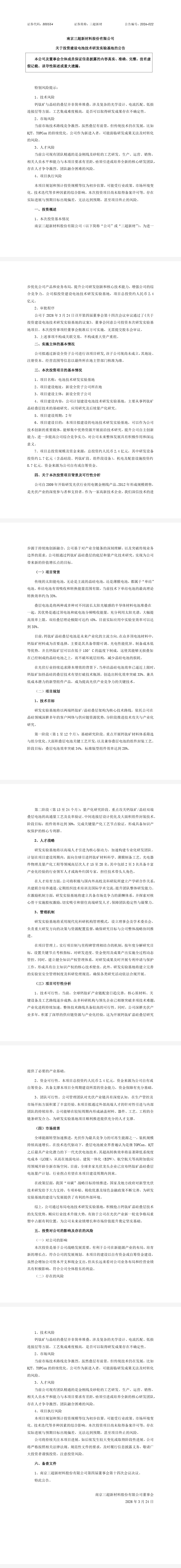 3月24日,三超新材發布《關于投資建設電池技術研發實驗基地的議案》公告,公司擬投資建設電池技術研發實驗基地,項目總投資約2.4億元。該項目旨在優化公司產品和業務布局,提升研發創新和核心技術能力,增強綜合競爭力。三超新材將通過新設全資子公司開展項目研發,項目名稱為電池技術研發實驗基地,建設地址為新設全資子公司所在地,建設周期 2 年,主要聚焦鈣鈦礦晶硅疊層技術的基礎、應用及量產化研究,總投資 2.4 億元中,研發設備投資約 1.7 億元(含...