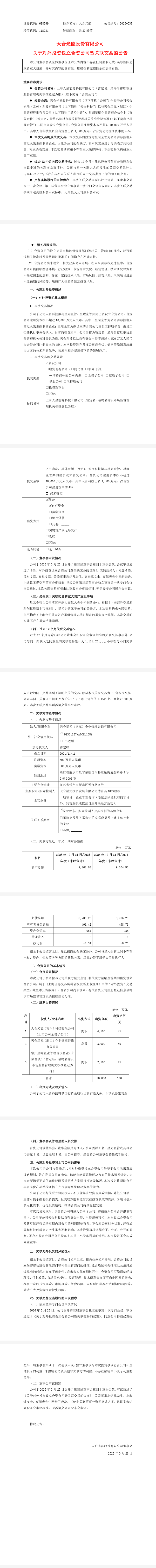 天合光能3月25日發(fā)布公告,公司全資子公司天合光能(常州)科技有限公司(簡(jiǎn)稱(chēng)“天合科技”)擬與天合星元(浙江)企業(yè)管理咨詢(xún)有限公司、常州星曜企業(yè)管理合伙企業(yè)(有限合伙)共同出資設(shè)立合資公司,合資公司注冊(cè)資本擬不超1億元。天合科技擬出資不超4500萬(wàn)元,占比45%。此次投資旨在發(fā)揮公司在光伏、儲(chǔ)能等能源系統(tǒng)解決方案的技術(shù)積累優(yōu)勢(shì),拓展在相關(guān)新場(chǎng)景下的跨領(lǐng)域應(yīng)用。