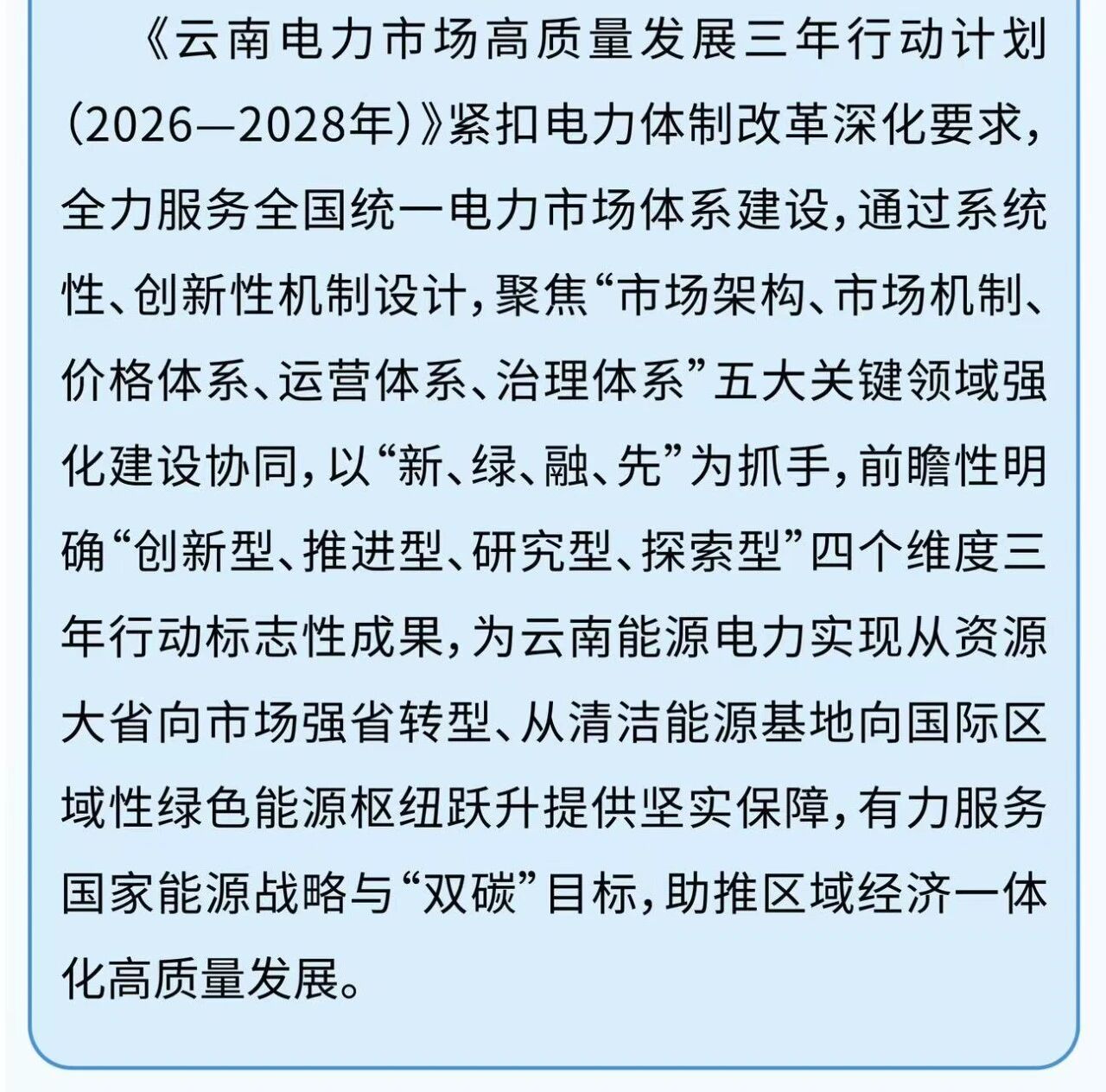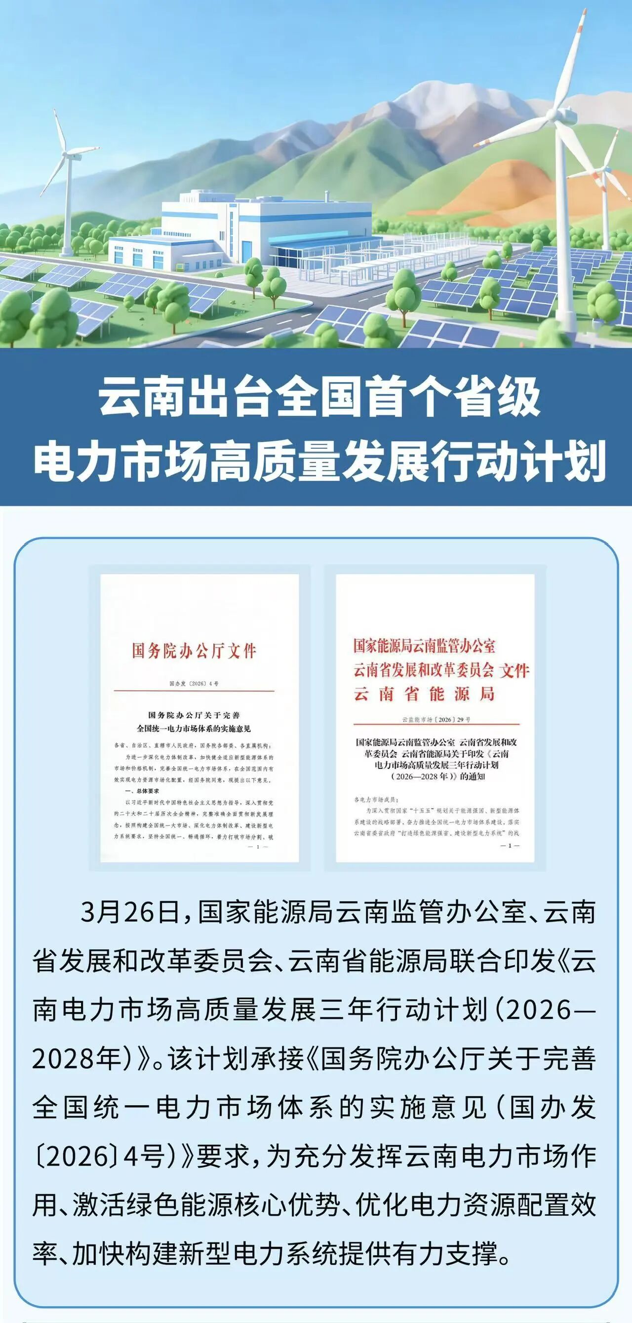 3月26日,國家能源局云南監管辦公室、云南省發展和改革委員會、云南省能源局聯合印發《云南電力市場高質量發展三年行動計劃(2026一2028年)》。