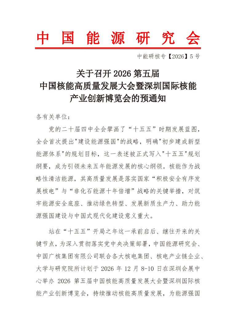 關(guān)于召開(kāi)2026第五屆中國(guó)核能高質(zhì)量發(fā)展大會(huì)暨深圳國(guó)際核能產(chǎn)業(yè)創(chuàng)新博覽會(huì)的預(yù)通知