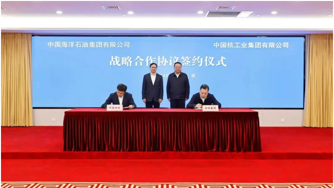 4月15日,中核集團黨組書記、董事長申彥鋒一行赴中國海洋石油集團有限公司,拜會中國海油黨組書記、董事長張傳江。雙方圍繞新能源開發、核電項目合作、科技創新等領域進行深入交流并簽署戰略合作協議。中國海油黨組成員、總會計師穆秀平,中核集團黨組成員、總會計師王學軍參加會見。