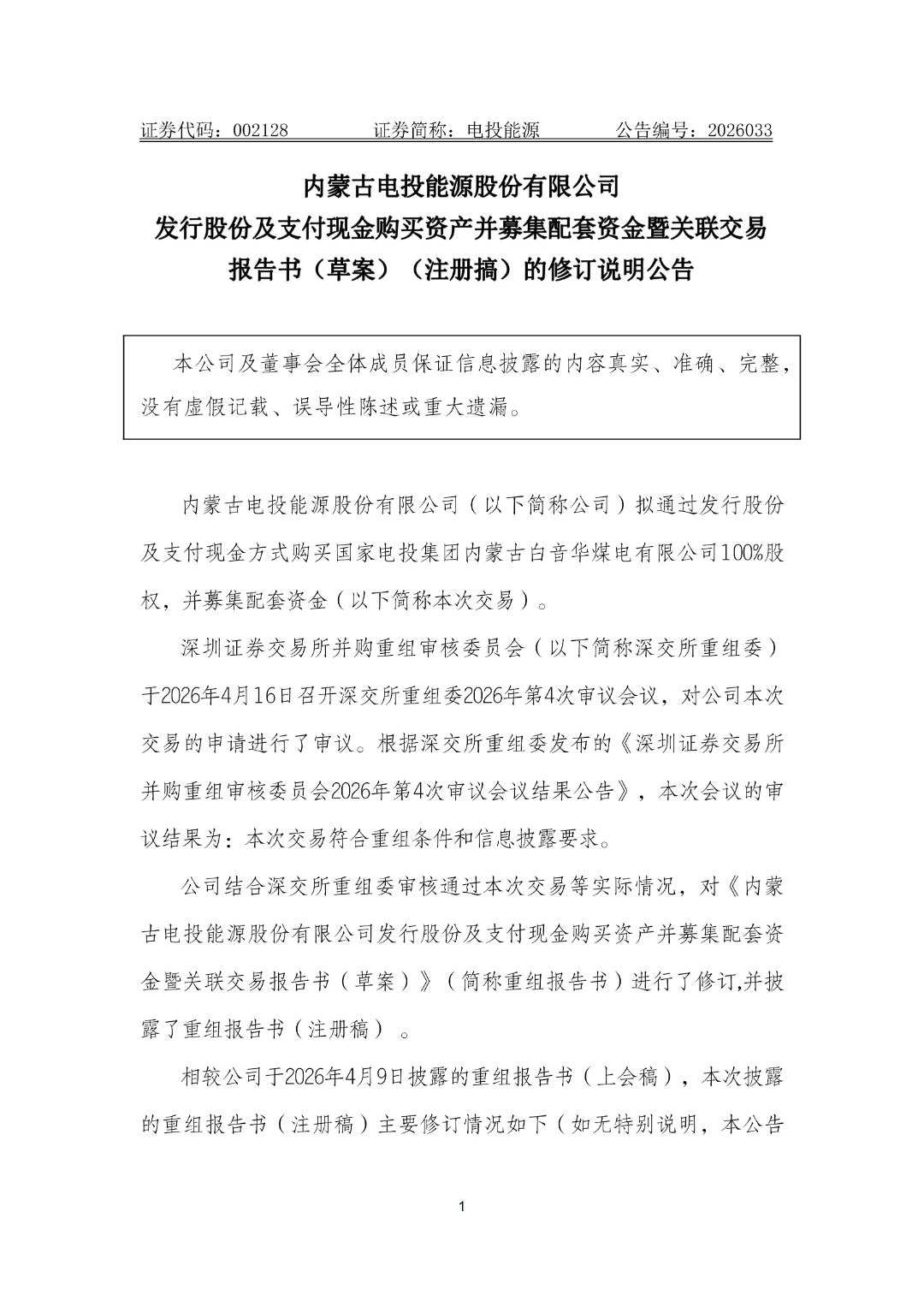4月16日,內蒙古電投能源股份有限公司(以下簡稱電投能源)公告稱,擬通過發行股份及支付現金方式購買國家電投集團內蒙古白音華煤電有限公司100%股權,并募集配套資金。深圳證券交易所并購重組審核委員會(以下簡稱深交所重組委)于4月16日召開深交所重組委2026年第4次審議會議,對本次交易的申請進行了審議。根據深交所重組委發布的《深圳證券交易所并購重組審核委員會2026年第4次審議會議結果公告》,本次會議的審議結果為: 本次交易符合重組條...