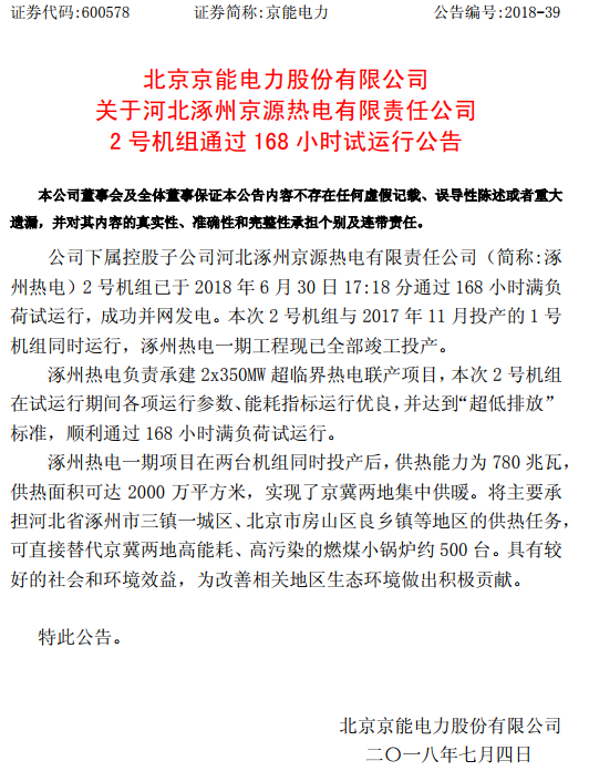 京能電力發(fā)布公告,下屬控股子公司涿州熱電2號機組已于6月30日17:18分通過168小時滿負荷試運行,成功并網發(fā)電。本次2號機組與2017年11月投產的1號機組同時運行,涿州熱電一期工程現(xiàn)已全部竣工投產。公告原文: