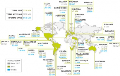 看看地圖(你可以在下面看到它放大)。雖然西班牙的可再生能源公司已經能夠征服全球市場,很少能展示自己在許多國家簽署五大洲的Renovagy,已經增加了項目超過600萬千瓦,這可能在一倍接下來的幾年。西班牙技術正在改變光伏太陽能,將其轉變為第一能源。