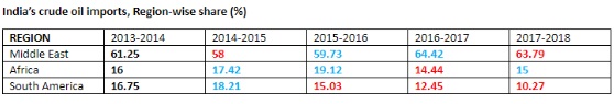 印度過去五年的區(qū)域原油進(jìn)口數(shù)據(jù)顯示,中東國家的市場份額增加,而非洲和南美洲的份額在此期間有所下降。2017 - 2018年中東國家的比例從2013-2014財(cái)政年度的61%增加到64%。上個(gè)財(cái)政年度非洲國家的市場份額略微下降至15%,而2013 - 2014年為16%。