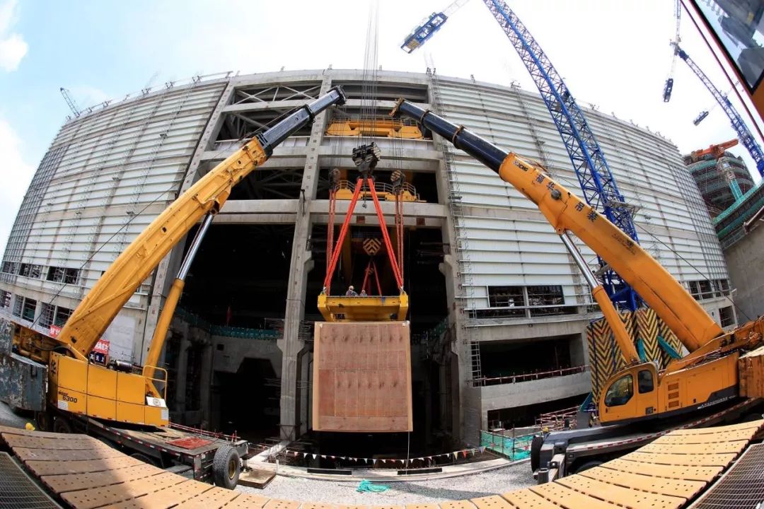凝汽器是常規島最大的輔機設備,殼體則是凝汽器的重要部件之一,共有4個模塊,最重模塊達到148噸, 采用模塊化供貨安裝,在現場組對拼焊成一個整體。本次殼體模塊吊裝采用廠房外大型履帶吊起重機和廠房內橋式起重機相互配合方式,通過抬吊和連續換鉤等工序完成吊裝作業。