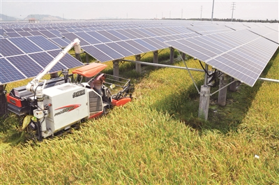 昨天,記者在基地看到,今年年初種下的300畝早稻已經成熟,飽滿的稻穗隨著微風沙沙作響,而收割機正在田地里飛快地收割,田間地頭上方是一排排整齊的太陽能面板,正在將陽光變成源源不斷的電源。