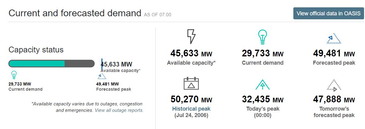 7月25日,CAISO的日前預測峰值為49,665兆瓦。該系統的可用容量為45,633兆瓦。如果不采取行動,該州正在考慮可能的停電情況。