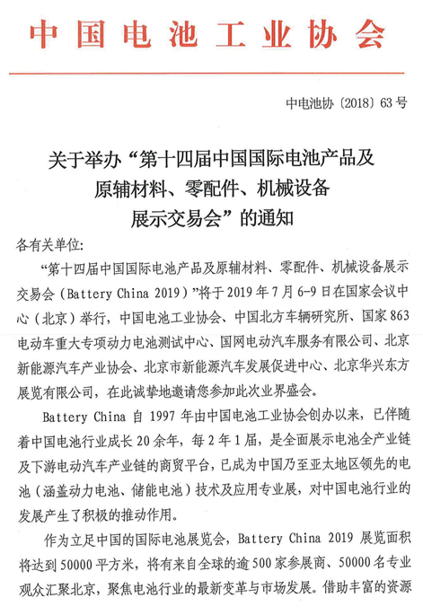 “第十四屆中國國際電池產品及原輔材料、零配件、機械設備展示交易會(Battery China 2019)”將于2019年7月6-9日在國家會議中心(北京)舉行,中國電池工業協會、中國北方車輛研究所、國家863電動車重大專項動力電池測試中心、國網電動汽車服務有限公司、北京新能源汽車產業協會、北京市新能源汽車發展促進中心、北京華興東方展覽有限公司,在此誠摯地邀請您參加此次業界盛會。