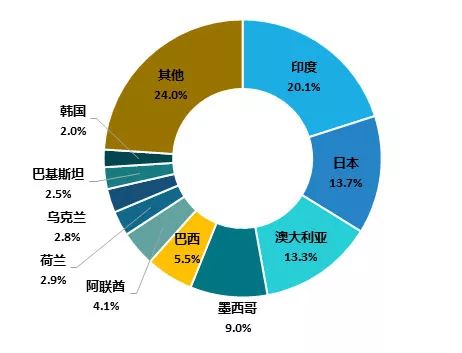2018年上半年,我國多晶硅進口量約為6.7萬噸,同比下滑4.3%。2018年1—5月電池片和組件出口總額55.13億美元,同比增加21.2%。其中電池片出口額3.53億美元,組件出口額51.6億美元,組件出口量約16GW。我國2012—2016年出口額一直處于下滑態勢,2017年再次實現增長,2018年1—5月繼續保持增長態勢,而且是在產品價格持續下滑的態勢下取得的。這主要是由于中國海外的電池片、組件產能開始釋放,這兩個環節各有8GW的海外產能,拉動了硅片和電池片的出口,同時我國光伏企業開拓國際市場的步伐也在進一步深化。從出口區域結構來看,集中度繼續降低,對出口前10名國家的出口金額占比為76%,同比下滑7.6個百分點,對澳大利亞、墨西哥、巴西、阿聯酋等新興市場出口快速增長。