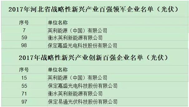 近日,按照河北省戰略性新興產業發展三年行動計劃部署要求,省發展改革委、省工業和信息化廳、省科技廳聯合發布了2017年河北省戰略性新興產業百強領軍企業和創新百強企業(簡稱“雙百強”)名單,英利多家公司榜上有名。