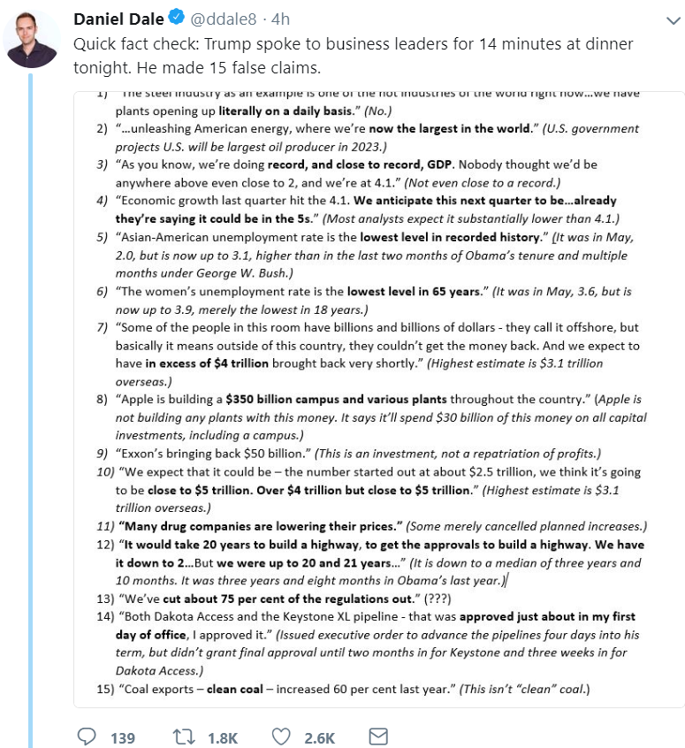 上周特朗普總統(tǒng)在晚宴上與商界領(lǐng)袖交談。華盛頓多倫多星報的記者丹尼爾戴爾發(fā)布了幾條有關(guān)晚宴的推文。在其中一篇文章中,他寫道: “快速事實檢查:特朗普今晚在晚宴上與商界領(lǐng)袖交談了14分鐘。他提出了15項虛假聲明。“