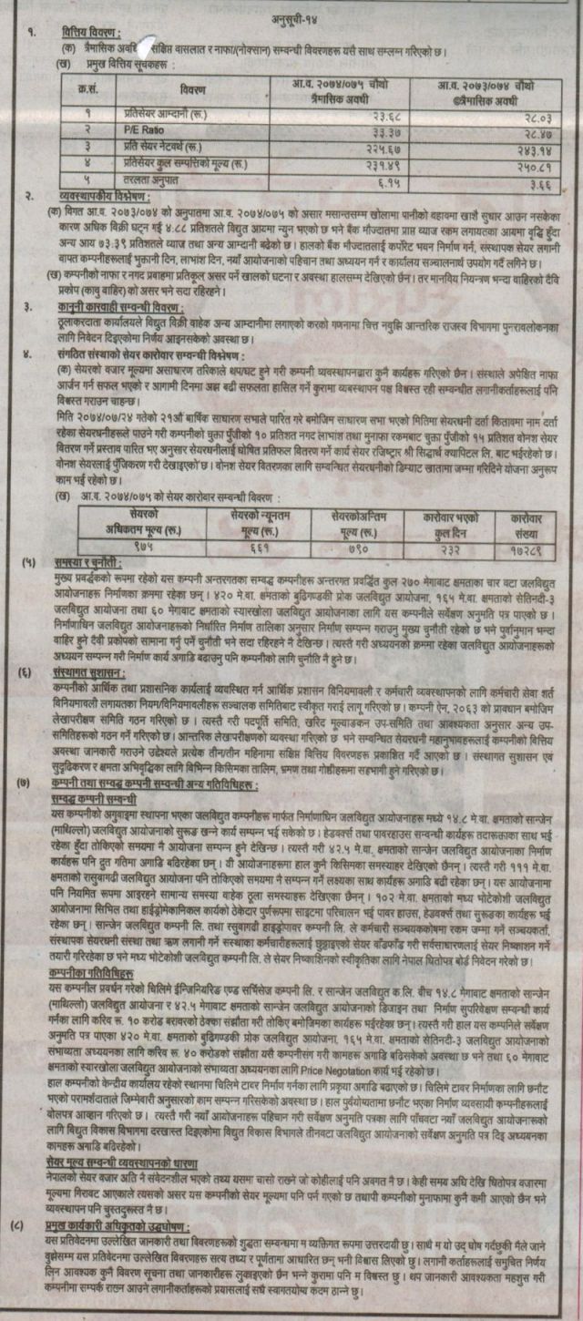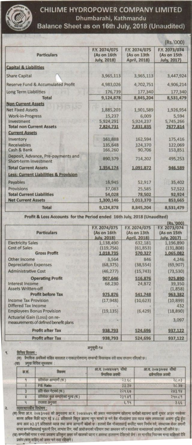 加德滿都(As)。Chillime水電公司已獲得盧比。93億賺取利潤。該利潤與之前的費(fèi)用進(jìn)行比較。16萬71萬多。本公司已在上一期間收費(fèi)。盈利93.7億美元。由于公司收入的增加,利潤增加了。利息收入增加73%至盧比。已達(dá)到6.6億。公司的盧比。已經(jīng)制造了10億1300萬。與早先的平均水平相比,這一收入低于4 87%。由于6月中旬水流量沒有改善,電力銷售下降。公司的收入收入 23位小數(shù)68,價(jià)格收入比率為33位小數(shù)37倍,凈利潤率為小數(shù)點(diǎn)后2.2位67。