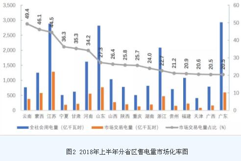 分省來看,市場(chǎng)交易電量占全社會(huì)用電量比重排序前三名的省份是云南、蒙西和江蘇,分別為49.4%、46.1%、44.5%;電力市場(chǎng)交易電量規(guī)模排序前三名的省份分別為江蘇1286億千瓦時(shí)、山東768億千瓦時(shí)、廣東599億千瓦時(shí);外受電市場(chǎng)交易電量排序前三名的省份分別是江蘇286億千瓦時(shí)、山東242億千瓦時(shí)和浙江160億千瓦時(shí)。