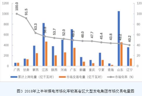2018年上半年,大型發(fā)電集團(tuán)煤電機(jī)組上網(wǎng)電量10302億千瓦時(shí),占其總上網(wǎng)電量的67.4%;市場(chǎng)交易電量3683億千瓦時(shí),市場(chǎng)化率為35.8%,其中跨區(qū)、跨省外送市場(chǎng)交易電量349億千瓦時(shí)。煤電上網(wǎng)電量平均電價(jià)(計(jì)劃與市場(chǎng)電量加權(quán)平均電價(jià),以下同)為0.3669元/千瓦時(shí),市場(chǎng)交易(含跨區(qū)跨省市場(chǎng)交易)平均電價(jià)為0.3340元/千瓦時(shí)。