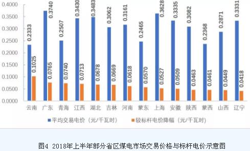 從分省煤電交易價(jià)格來看,與標(biāo)桿電價(jià)比較降幅最大的是云南,其市場(chǎng)交易平均電價(jià)為0.2333元/千瓦時(shí),與標(biāo)桿電價(jià)相比降幅0.1025元/千瓦時(shí),其次為廣東、青海、江西,其交易平均電價(jià)分別為0.3740元/千瓦時(shí)、0.2507元/千瓦時(shí)、0.3430元/千瓦時(shí),降幅均超過0.07元/千瓦時(shí)。