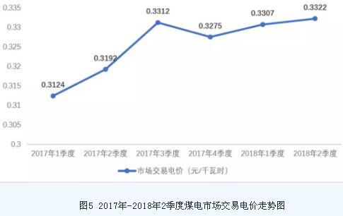2017年以來,隨著煤炭市場(chǎng)價(jià)格波動(dòng)拉升以及市場(chǎng)交易的理性回歸,煤電市場(chǎng)交易電價(jià)呈緩步回升趨勢(shì)。2018年2季度,大型發(fā)電集團(tuán)煤電市場(chǎng)交易平均電價(jià)為0.3322元/千瓦時(shí),同比回升4.07%。