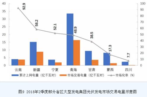 2018年上半年,大型發(fā)電集團(tuán)光伏發(fā)電累計(jì)上網(wǎng)電量157億千瓦時(shí),占其總上網(wǎng)電量的1.0%;市場(chǎng)交易電量37億千瓦時(shí),市場(chǎng)化率為23.4%,其中跨區(qū)跨省交易電量10億千瓦時(shí),占其市場(chǎng)交易電量的28.1%。