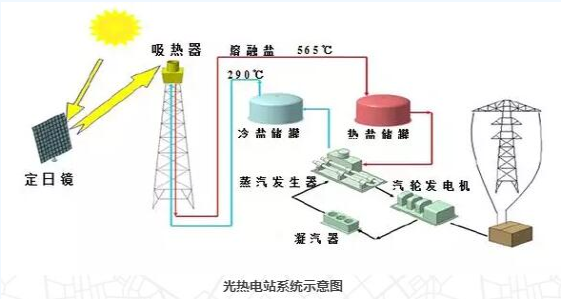 光熱電站位于光伏電站南側,采用塔式熔鹽技術,儲熱時長為12小時。