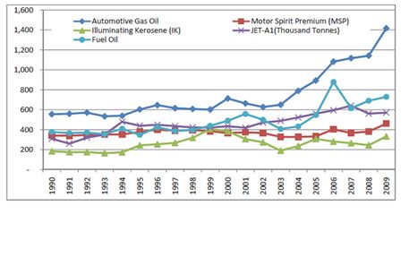 石油是肯尼亞商業能源的主要來源,多年來,石油占該國商業能源需求的約80%。2006年,肯尼亞銷售了440萬立方米的石油產品。這42萬米3是煤油和68000米3是LPG??夏醽喌氖拖M總量從2003年的260萬立方米增加到2006年的373萬立方米。消費量保持上升趨勢。截至2009年,對石油產品的需求量為3,656千噸。截至2007年,肯尼亞有一家煉油廠,蒙巴薩煉油廠,其銘牌產能為每天90,000桶。自其委托以來,煉油廠尚未滿負荷運轉。
