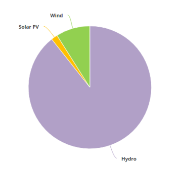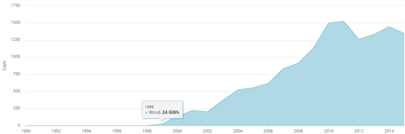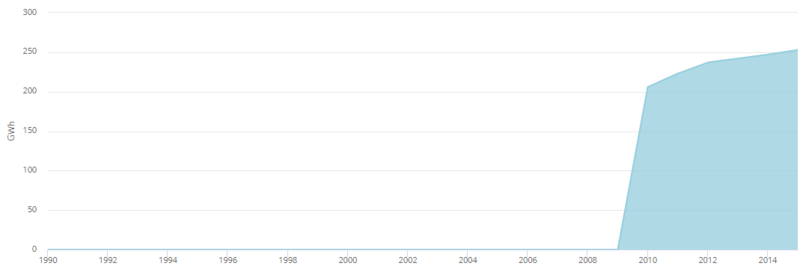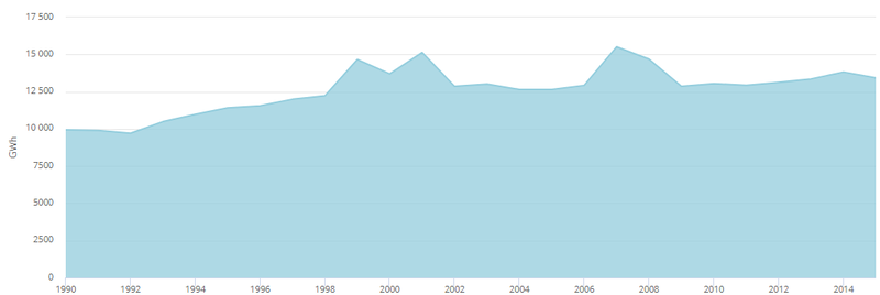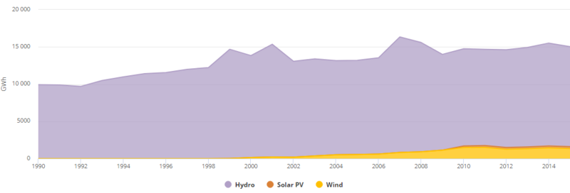 2012年,可再生能源發(fā)電量達(dá)到14,855 GWh [18],占總發(fā)電量的9.04%。水力發(fā)電裝置產(chǎn)生13,358吉瓦時(8.13%),而風(fēng)力發(fā)電又貢獻(xiàn)了1,260吉瓦時(0.77%)和太陽能光伏發(fā)電237吉瓦時(0.14%)。