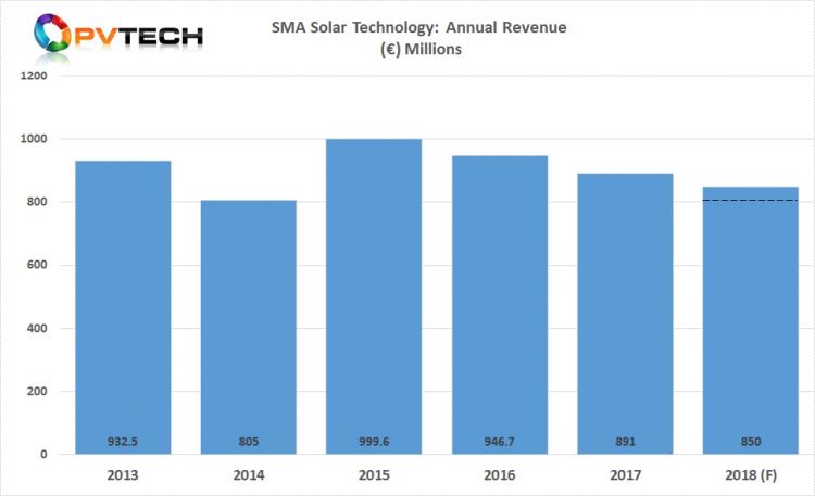 SMA Solar表示,它將2018年的預期收入降至8億歐元至8.5億歐元,低于此前預期的9億歐元至10億歐元。