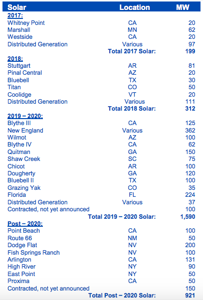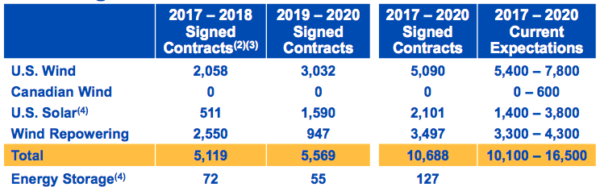 這不僅包括447兆瓦的太陽能,還包括120兆瓦的電池存儲項目。這些新項目意味著NextEra Energy Resources現在擁有511兆瓦已簽訂的2017-2018期間項目合同。但是,在2019 - 2020年,該活動真正開始,另有1.6吉瓦的太陽能項目即將到期。由于一些項目將被擱置或出售,其他項目將被添加,NextEra預計從2017年到2020年將發展1.4至3.8吉瓦的太陽能。