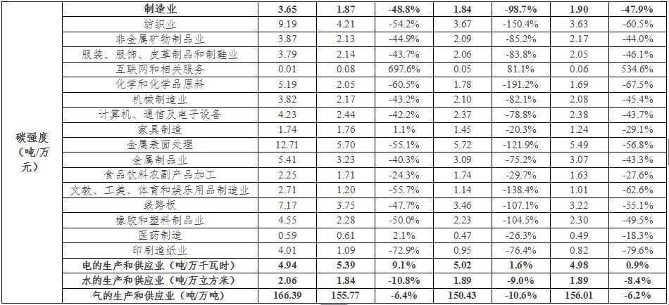 這說明,在碳市場機制的作用下,傳統(tǒng)行業(yè)原有的粗放式發(fā)展模式得到了約束,自然地遵從經濟規(guī)律調整企業(yè)的產品結構,在單位增加值下能耗比最低,或者在單位能耗下增加值最高,最終實現(xiàn)了排放量和排放強度的雙重下降。