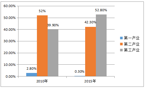 統(tǒng)計數(shù)據(jù)顯示,深圳第三產業(yè)比重從2008年開始首次超過第二產業(yè)。在創(chuàng)新驅動發(fā)展戰(zhàn)略推動下,2013年-2015年期間,深圳按照“十二五”節(jié)能減排目標,將產業(yè)結構調整、能源結構清潔戰(zhàn)略整合提升成為低碳發(fā)展規(guī)劃,引導產業(yè)結構調整和投資方向。從現(xiàn)有的產業(yè)發(fā)展情況來看,以創(chuàng)新驅動低碳發(fā)展效果明顯,2013年二、三產業(yè)產業(yè)結構為43.5:56.5,2015年為產值占比為41.2:58.8,碳排放占比為42.3:52.8,兩大產業(yè)比例已發(fā)生結構性改變。