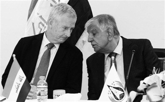 1月18日,BP中東地區負責人湯申德(左)與伊拉克石油部長盧埃比簽署合作協議,雙方將共同提高該國北部石油重鎮基爾庫克的原油產量。