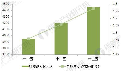 圖表7:中國鋼鐵領域節能量與相應投資額分析與預測(單位:億噸標準煤,億元)