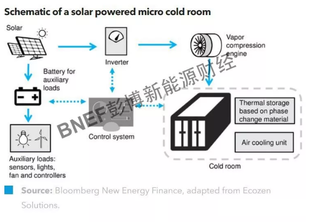 冷藏需求開始不斷為偏遠地區(qū)的微電網(wǎng)創(chuàng)造新的機會,有望為微電網(wǎng)帶來重要的潛在收入。由于缺乏冷鏈基礎設施,許多新興市場中的農(nóng)產(chǎn)品會在收獲后面臨嚴重損失,僅印度一國在這方面的損失就超過約140億美元。在冷藏需求無法滿足、電力供應不足,及光伏電力具備價格優(yōu)勢的大環(huán)境下,一些下游光伏運營商可能會迎來新的機會。