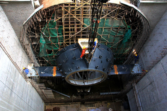 中鐵二十局建設(shè)者吊裝發(fā)電機組管型座內(nèi)環(huán)