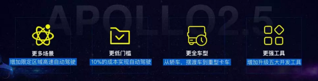 2018年4月19日——在百度宣布推出Apollo計(jì)劃整整一周年后,這家互聯(lián)網(wǎng)巨頭于北京競(jìng)園藝術(shù)中心舉行了“Apollo Meetup——Apollo2.5 開放技術(shù)發(fā)布會(huì)”,正式對(duì)外發(fā)布Apollo 2.5版本。與之前的版本相比,本次 Apollo2.5在更多場(chǎng)景、更低門檻、更全車型、更強(qiáng)工具四個(gè)方面進(jìn)行了拓展,可滿足開發(fā)者的更多需要。