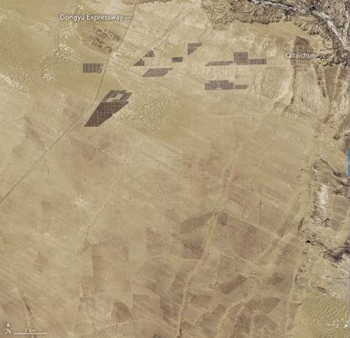 NASA(美國國家航空航天局)的衛星圖像記錄下了龍羊峽光伏電站由一組組面板發展為連片的太陽能發電站的過程。