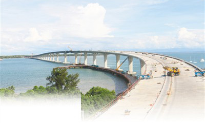 5月18日,由中國交建承建的文萊大摩拉島大橋竣工,這是文萊首座跨海大橋,也是連接文萊摩拉區和海上摩拉島的重要橋梁。淡布隆跨海大橋項目是文萊歷史上最大的基礎設施工程,全線總長約30千米。在這座大橋建設中,中國建筑工程總公司中標的CC4標段全長約11.8千米,其中有11.3千米是穿越森林沼澤地的高架橋。